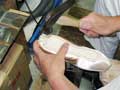 製甲により立体的に縫い合わせた物を型にかぶせ、ボックスの部分に芯を貼りあわせ、トウシューズの形に成型します。